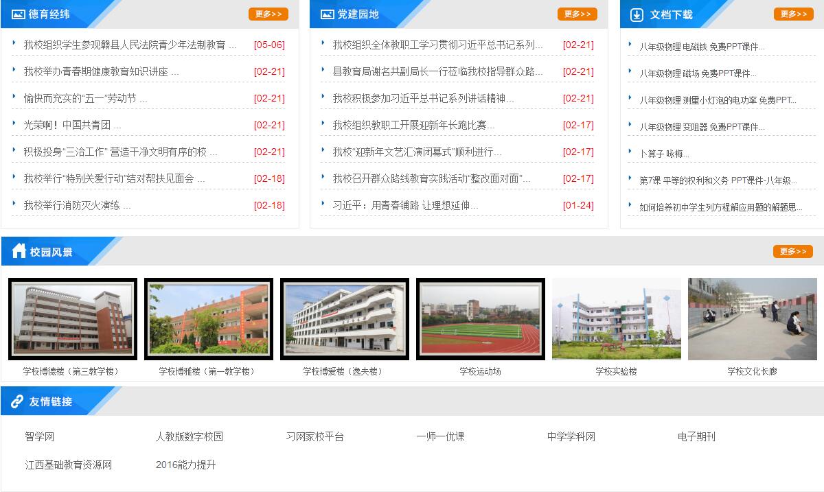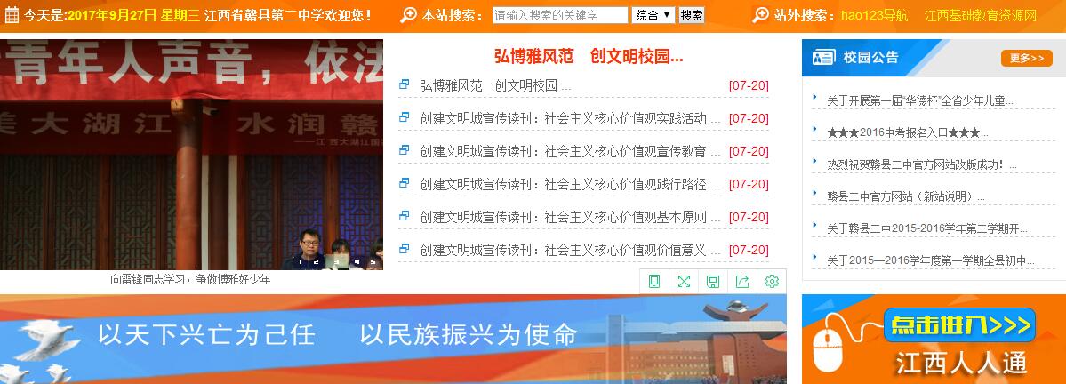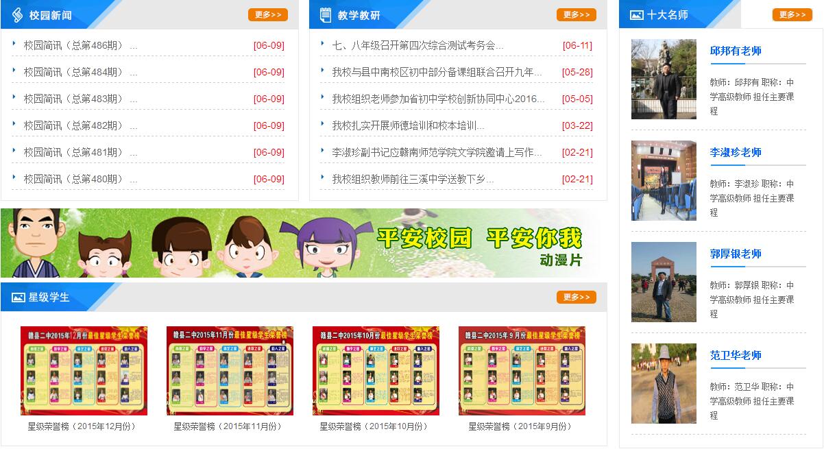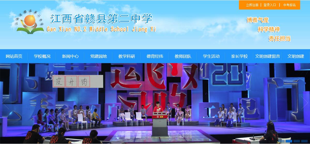 江西省贛縣第二中學校園占地60畝,在校學生4180人,共61個教學班;教職工195人,其中:國家級優(yōu)秀教練員1人,省特級教師1人,省學科帶頭人4人,省十佳班主任1人,省十佳語文教師1人,省骨干教師16人,市學科帶頭人和骨干教師31人。 贛縣二中以“博學多思、博德廣善、博愛泛眾;舉止優(yōu)雅、言行文雅、情趣高雅”為精神內(nèi)涵,以“民主治校、科學管理、共筑和諧、提升質量”的辦學理念,以“全市起示范、全省爭地位、全國有影響”為奮斗目標,以“人文為本、制度為準、工作為重”為職業(yè)素養(yǎng),以“團結進取、吃苦耐勞、開拓創(chuàng)新、樂觀向上”為文化核心,以“環(huán)境更優(yōu)美、條件更現(xiàn)代、理念更先進、校風更純正、質量更卓越”為基本任務,“傳承 “篤志、博學、厚德、自律”校訓,形成了“愛崗敬業(yè)、開拓進取”的教風和“求知、健體、懂事、創(chuàng)新”的學風。 全體二中人與時俱進,開拓創(chuàng)新,取得一系列成就。中考成績高分段人數(shù)、特優(yōu)生、優(yōu)生人數(shù)及一分兩率等各項指標名列前茅。各類競賽碩果累累,先后有400多人次獲全國競賽等級獎,其中有84人次獲全國競賽一等獎,物理學科兩度榮獲全國團體(江西賽區(qū))一等獎,兩次作為贛州市初中學校唯一代表參加了江西省教育博覽會。連續(xù)五次榮獲中國青少年機器人競賽優(yōu)秀學校稱號,榮獲中國青科輔團體會員學校、全國青少年科學調查體驗活動試點學校、全國未成年人生態(tài)道德教育示范學校、中國機器人競賽優(yōu)秀學校、國家級規(guī)范漢字書寫教育特色學校、中國宋慶齡少年兒童科技發(fā)明示范學校、江西省實施素質教育示范學校、江西省基礎教育課程改革工作先進單位、江西省教育系統(tǒng)先進集體、江西省航模車模重點學校等榮譽稱號。2013年7月,由中央電視臺直接指定為江西省初中學校的唯一代表,參加了央視科教頻道舉辦的首屆中國漢字聽寫大會,獲得了社會各界的廣泛贊譽。