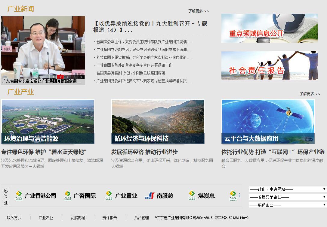 廣業(yè)集團(tuán)始終專注于綠色環(huán)保領(lǐng)域,以維護(hù)廣東“碧水藍(lán)天綠地”為己任,形成了綠色環(huán)保產(chǎn)業(yè)“兩大門類七大領(lǐng)域”的業(yè)務(wù)格局,突出發(fā)展環(huán)境治理與清潔能源、循環(huán)經(jīng)濟(jì)與環(huán)保科技主業(yè),并積極培育“云平臺與大數(shù)據(jù)應(yīng)用”業(yè)務(wù)。目前控股貴糖股份(證券代碼:000833)、宏大爆破(證券代碼:002683)、廣咨國際(證券代碼:836892)三家上市公眾公司,擁有“廣業(yè)環(huán)保、“云硫”、“南聯(lián)”三個廣東省十佳自主品牌。2014年,公司位居中國企業(yè)500強(qiáng)第388位、廣東大型企業(yè)競爭力50強(qiáng)第28位、廣東省50家自主創(chuàng)新標(biāo)桿企業(yè)第一位;2015年,公司位居廣東省企業(yè)500強(qiáng)第61位、廣東省服務(wù)業(yè)百強(qiáng)第19位,榮獲“廣東省自主創(chuàng)新工作優(yōu)秀組織單位”稱號;2016年,公司位居廣東省企業(yè)500強(qiáng)第73位、廣東省服務(wù)業(yè)百強(qiáng)第25位。