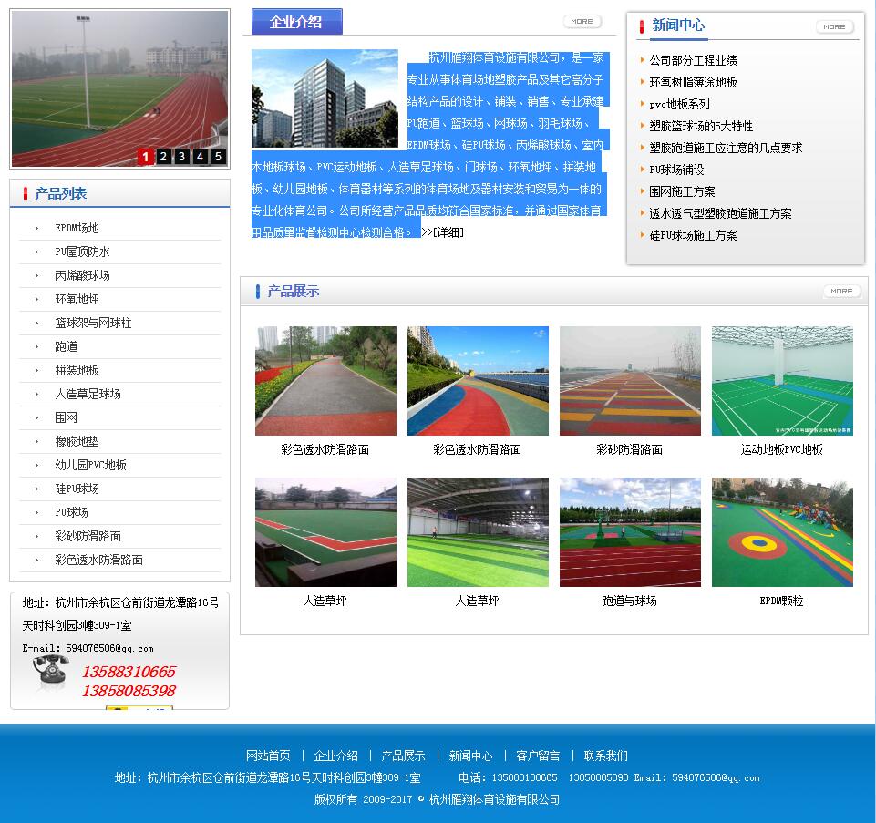 杭州雁翔體育設施有限公司,是一家專業(yè)從事體育場地塑膠產品及其它高分子結構產品的設計、鋪裝、銷售、專業(yè)承建PU跑道、籃球場、網球場、羽毛球場、EPDM球場、硅PU球場、丙烯酸球場、室內木地板球場、PVC運動地板、人造草足球場、門球場、環(huán)氧地坪、拼裝地板、幼兒園地板、體育器材等系列的體育場地及器材安裝和貿易為一體的專業(yè)化體育公司。公司所經營產品品質均符合國家標準,并通過國家體育用品質量監(jiān)督檢測中心檢測合格。
