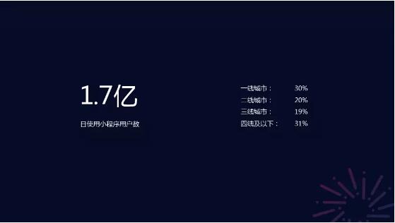 小程序作為一種新的應(yīng)用形態(tài),逐漸被廣大用戶所接受,目前日使用小程序用戶數(shù)達(dá)1.7億,有一半用戶分布于一線城市和二線城市,讓我們可喜的是,三線城市和四線及以下城市的使用也很廣泛。