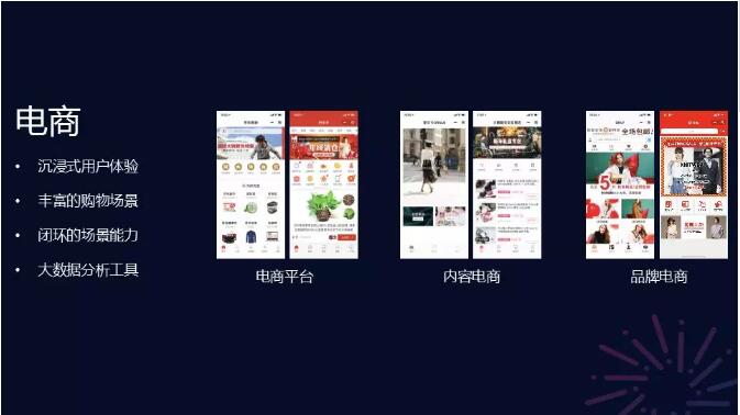 電商領(lǐng)域,小程序和行業(yè)的合作伙伴一起找到了一些新的增長(zhǎng)點(diǎn);95%的平臺(tái)電商已接入小程序,如京東/拼多多/蘑菇街等,小程序建立了新的購物習(xí)慣;微信中的新場(chǎng)景——內(nèi)容電商受到歡迎。