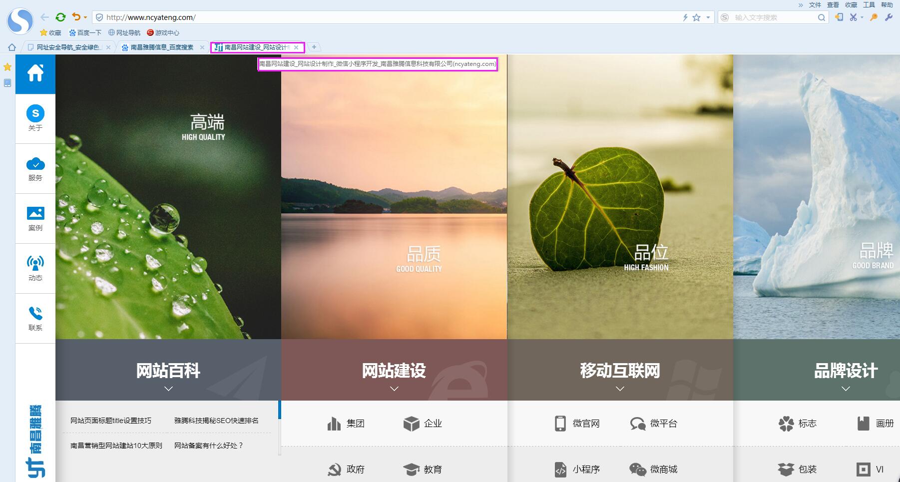 我們之前有看到有些企業(yè)的網(wǎng)站連標(biāo)題都沒有,當(dāng)時(shí)特別難以理解是什么樣的程序員寫的網(wǎng)站程序竟然網(wǎng)站沒有標(biāo)題,這樣的網(wǎng)站怎么被搜索引擎收錄?以后怎么做SEO優(yōu)化推廣呢?作為南昌網(wǎng)站建設(shè)專業(yè)的公司,我們深知一個(gè)網(wǎng)站的標(biāo)題、網(wǎng)頁的標(biāo)題對(duì)于一個(gè)網(wǎng)站而言是多么的至關(guān)重要。